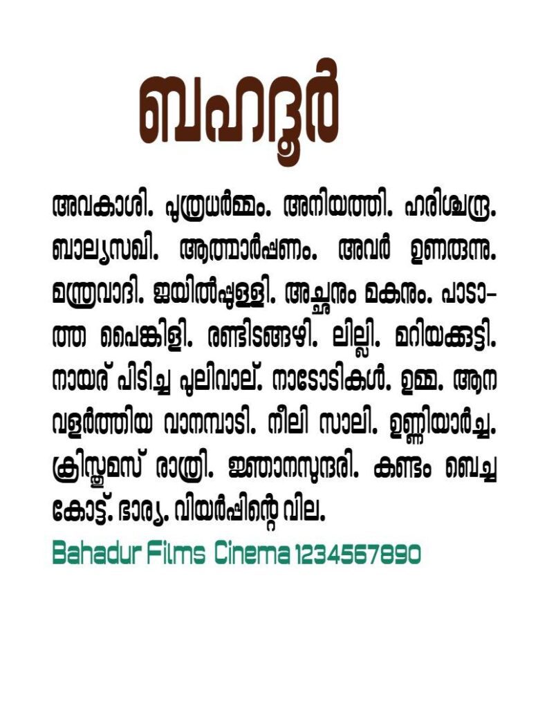 The Bahadur font draws its foundational geometry from the RIT Uroob typeface and stands out as an ornamental font ideal for use in book titles and signboards. It is a tribute not only to Bahadur’s vibrant personality and legacy but also to the artistic spirit of Namboodiri.